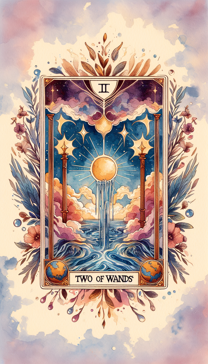 The Two of Wands is the second card in the Wands suit of the tarot deck. It represents planning, decisions, and future possibilities. It is often associated with personal power, worldly outlook, and the need to choose a direction.